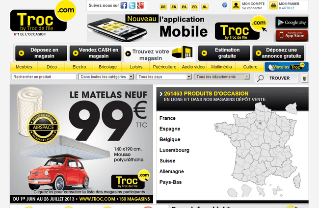 Venir chez Troc.com, c’est bénéficier de 30 ans d’expérience, tout en profitant d’une offre répondant aux besoins de chacun. Mais Troc.com, c’est aussi un site internet, www.troc.com, qui référence plus de 300 000 articles, et une application mobile pour Iphone et Androïd.
