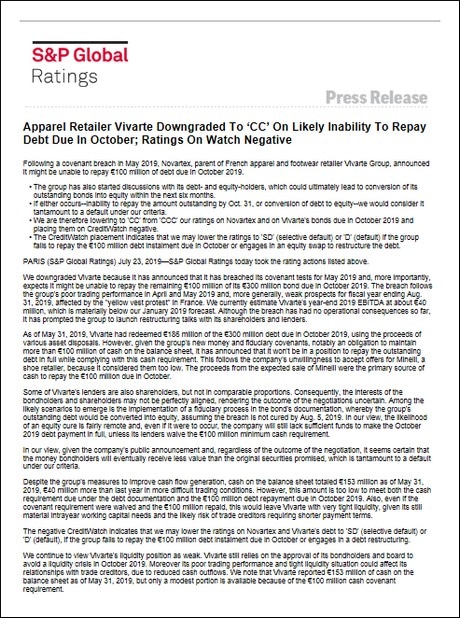 - Nous abaissons donc nos notes sur «Novartex» et sur les obligations de Vivarte échéant en octobre 2019 de «CCC» à «CC» et nous les plaçons en négatif sur CreditWatch.