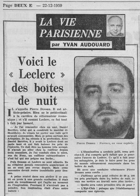 « Il s’appelle Pierre Dessau ». Nous sommes alors le 22 décembre 1959. Un article de la presse parisienne, publie un article sur une personne fraîchement convertie aux principes d’Edouard Leclerc. Seul hic : il décide de les appliquer dans le domaine des boites de nuit !